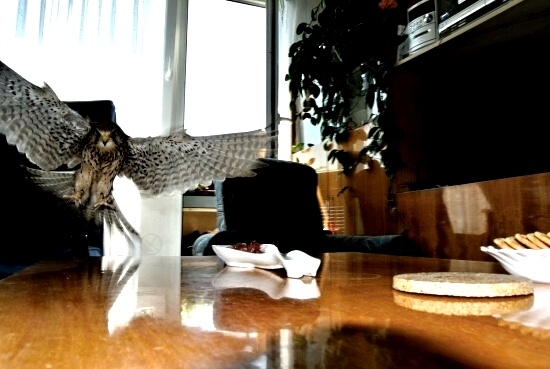 Povšimněte si rozpětí křídel samičky - balkónové dveře mají šíři 80 cm.