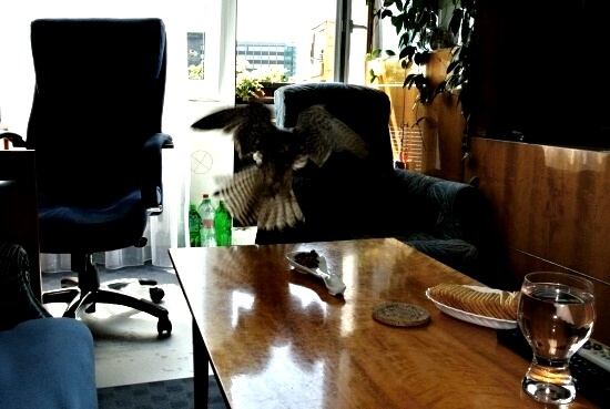 Udělal jsem si oběd a začal baštit. Balkónové dveře byly otevřené stejně tak jako vždycky a najednou seděla mamina-loňské mládě na křesle a zvídavě na mne koukala.