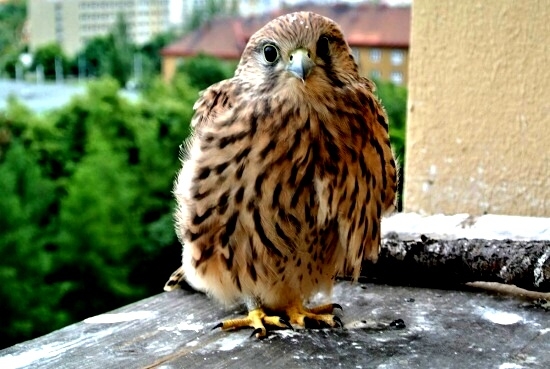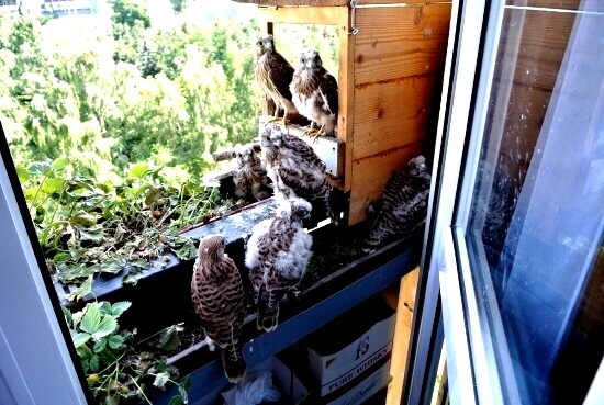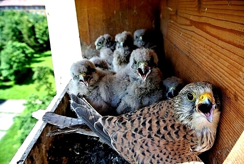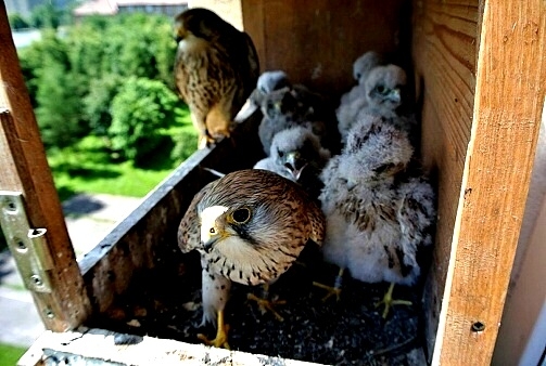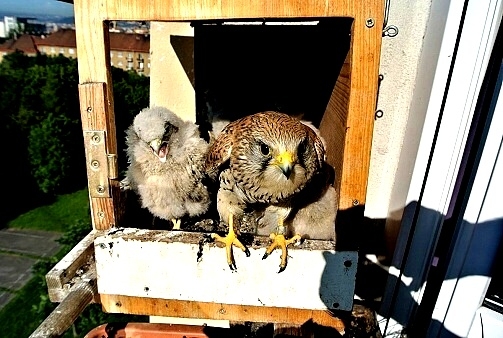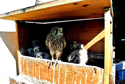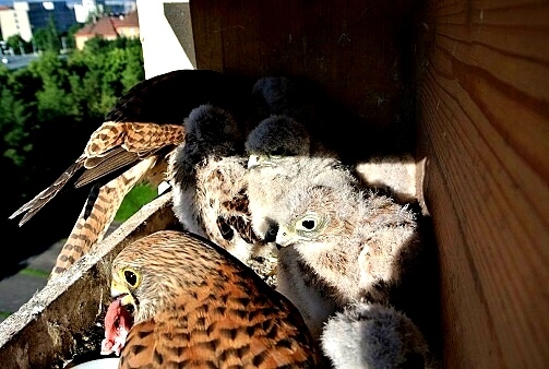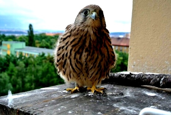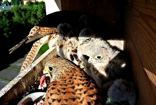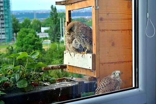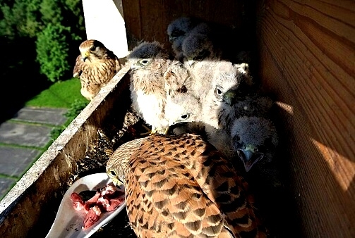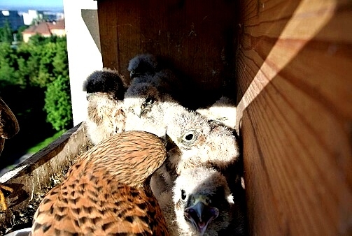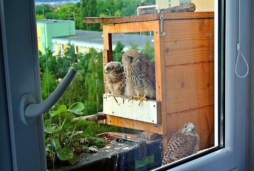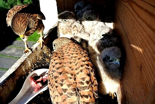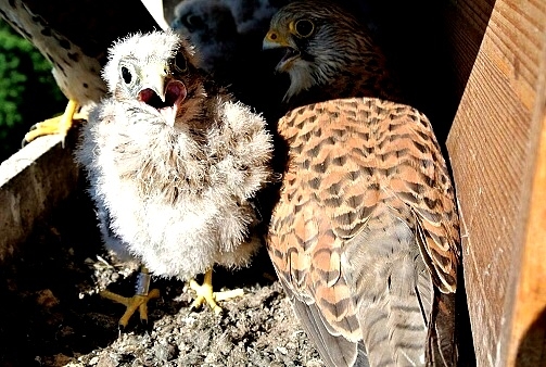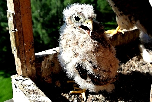 První poštolka si dodala odvahu a vyletěla hned po ránu nahoru na boudu. Asi to bylo pro ni překvapením, prohlížela si okolí z větší výšky. Po okouknutí terénu musela sletět dolů, protože mezitím jsem jim dal do boudy ranní masíčko a to přece nemůže nechat jen tak bez povšimnutí.